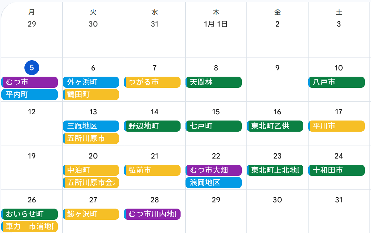 | 東北町乙供地区 | 1/16 | 10:00-12:00 | 東北町 老人福祉センター町 |