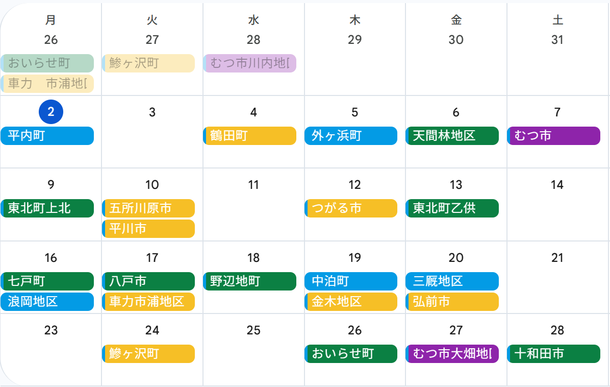 | 外ヶ浜町 | 2/5 | 10:00-12:00 | 蟹田公民館 |